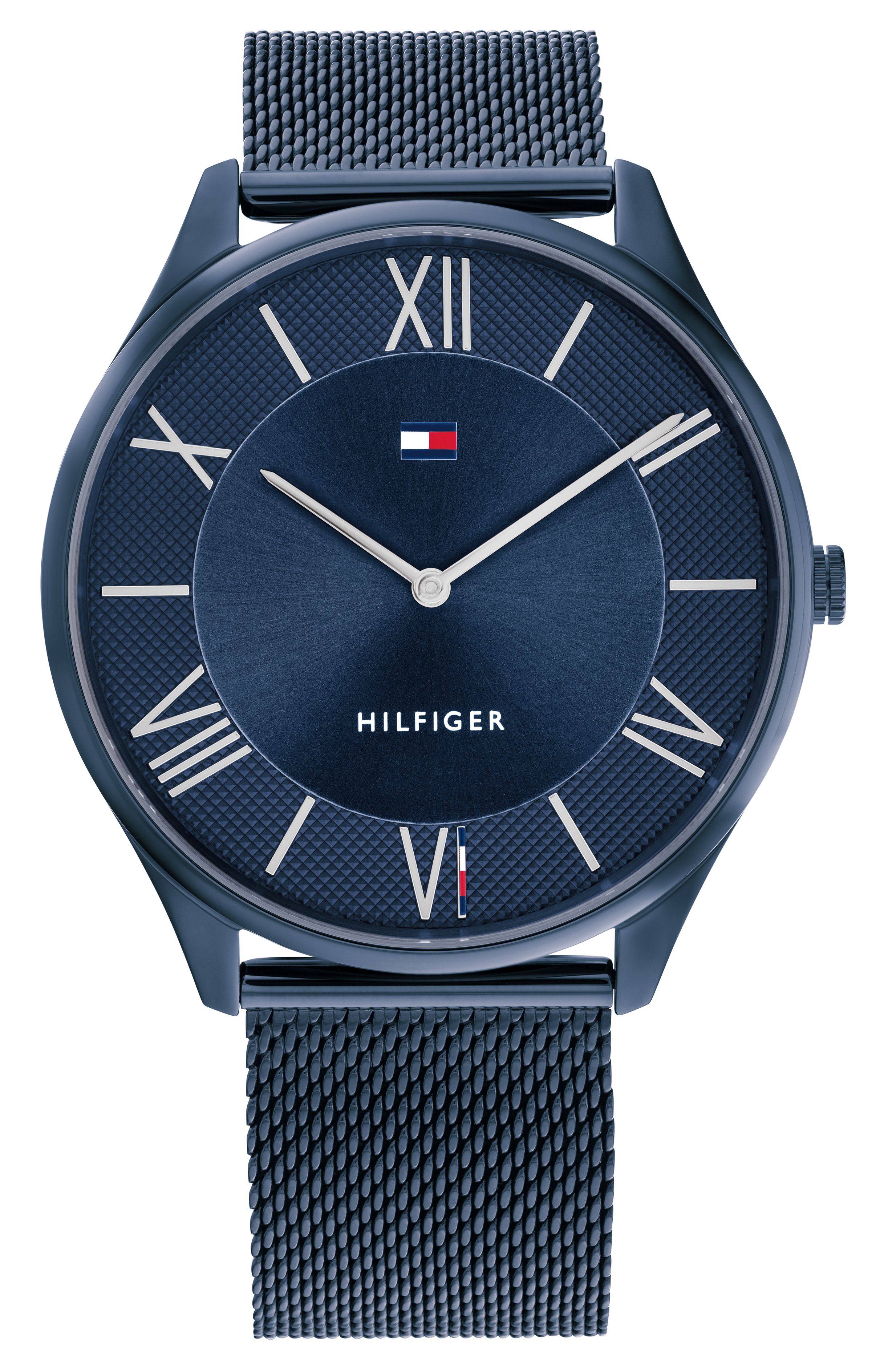 Zegarek Tommy Hilfiger 1710514 to stylowy model dla mężczyzn, wyróżniający się eleganckim designem. Posiada granatową tarczę z delikatnym oraz wyraźnymi rzymskimi cyframi i smukłymi wskazówkami w srebrnym kolorze oraz pasek stalowy typu mesh.