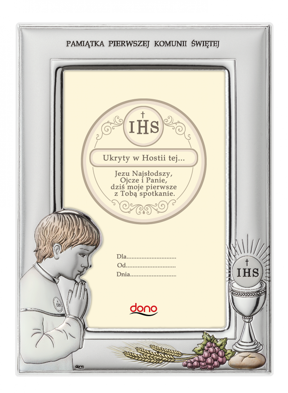 Ramka srebrna z podpisem: "PAMIĄTKA PIERWSZEJ KOMUNII ŚWIĘTEJ" z wizerunkiem modlącego się chłopca oraz kielicha z Hostią.