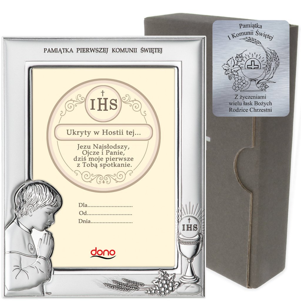 Ramka srebrna z podpisem: "PAMIĄTKA PIERWSZEJ KOMUNII ŚWIĘTEJ" z wizerunkiem modlącego się chłopca oraz kielicha z Hostią.